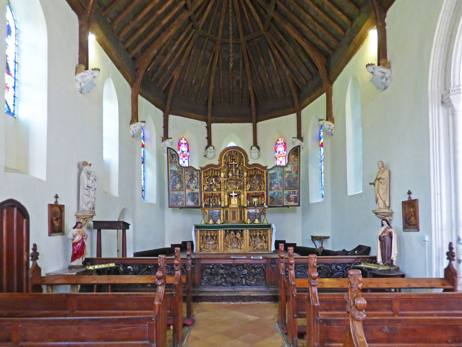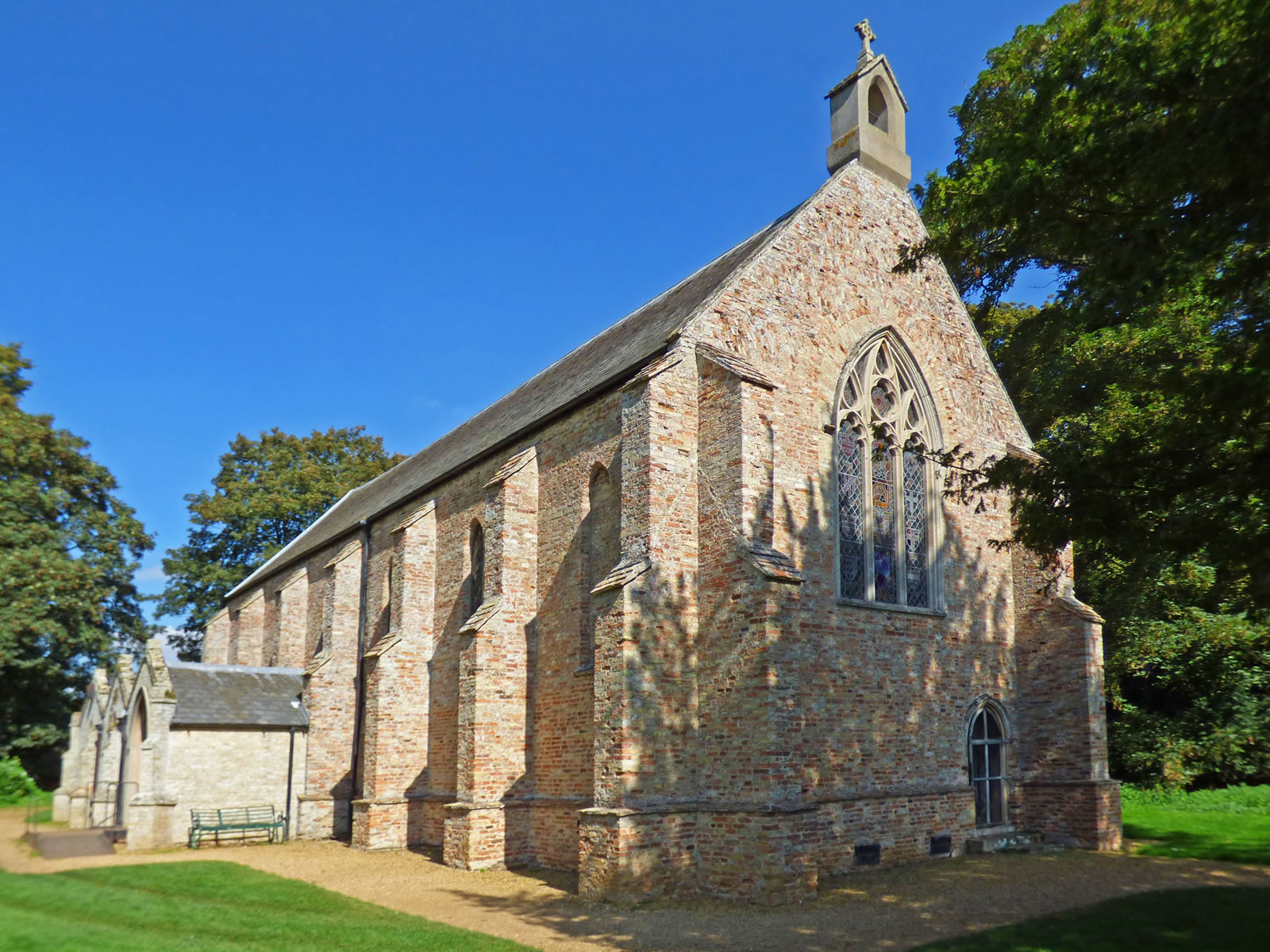 The Catholic Chapel is located in the grounds of Oxburgh Hall and was built during the 1830's. It is still owned by the Bedingfield family, who use it regularly for Mass. The centre-piece of the chapel is the Retable (the ornament at the front), which depicts carvings and paintings from the Passion. The chapel also houses the tomb of the 6th Baronet, who built the chapel in the first place. |