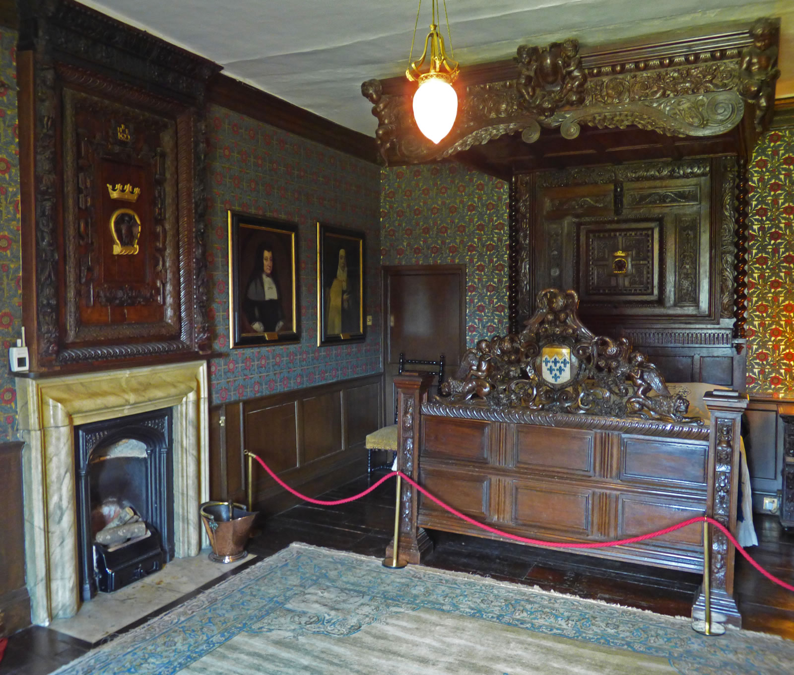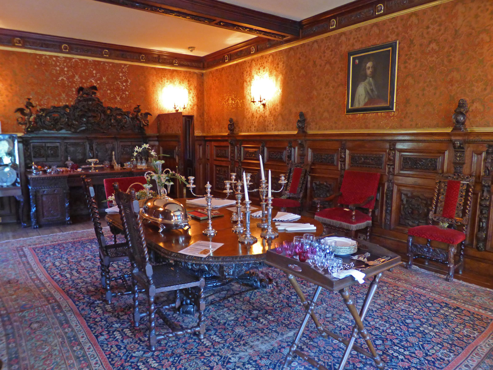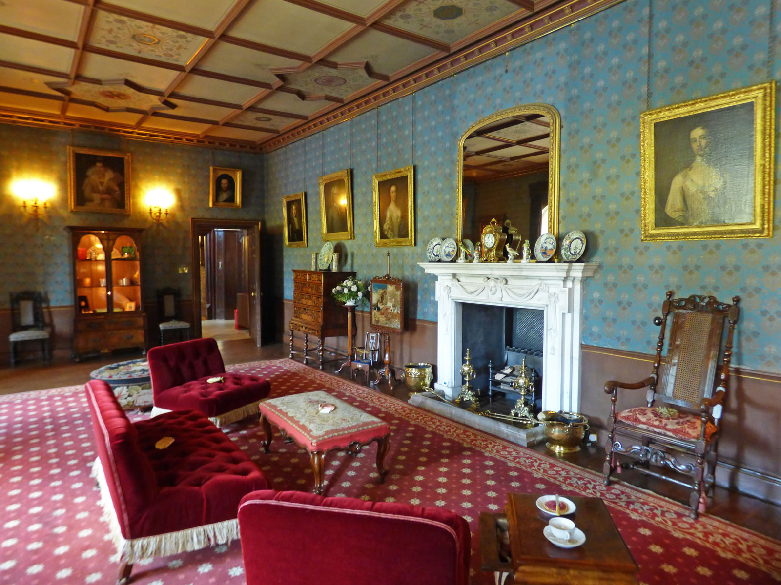 Moving Inside, the South Corridor takes visitors into the Ground floor rooms of the hall. The Saloon's primary function was as a picture gallery and many fine 19th century portraits are displayed here. The West Drawing Room contains many pieces of heavily carved dark wood furniture, set around a fireplace. The Library was created during the mid 19th century and filled with books on a wide range of subjects such as history, theology, philosophy and some classics. But there are also books on farming and also a significant collection of medieval manuscripts. The Dining Room contains heavily carved wood panelled walls and an elaborate fireplace. |