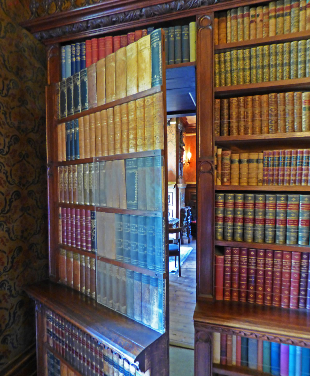 The north wall of the Library seems to contain a complete wall of books. However, closer inspection reveals that the shelves of books actually contain a concealed doorway leading to the Dining Room! The imitation book spines contain fake books that include Victorian puns relating to family history.